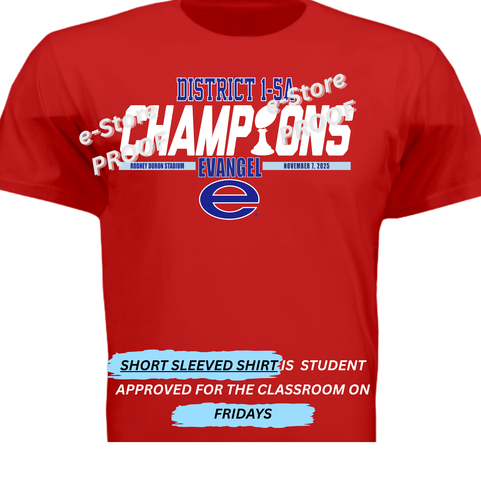 The short-sleeved District Champions shirt has been classroom approved as a Friday Spirit Shirt during the 2025-2026 school year.